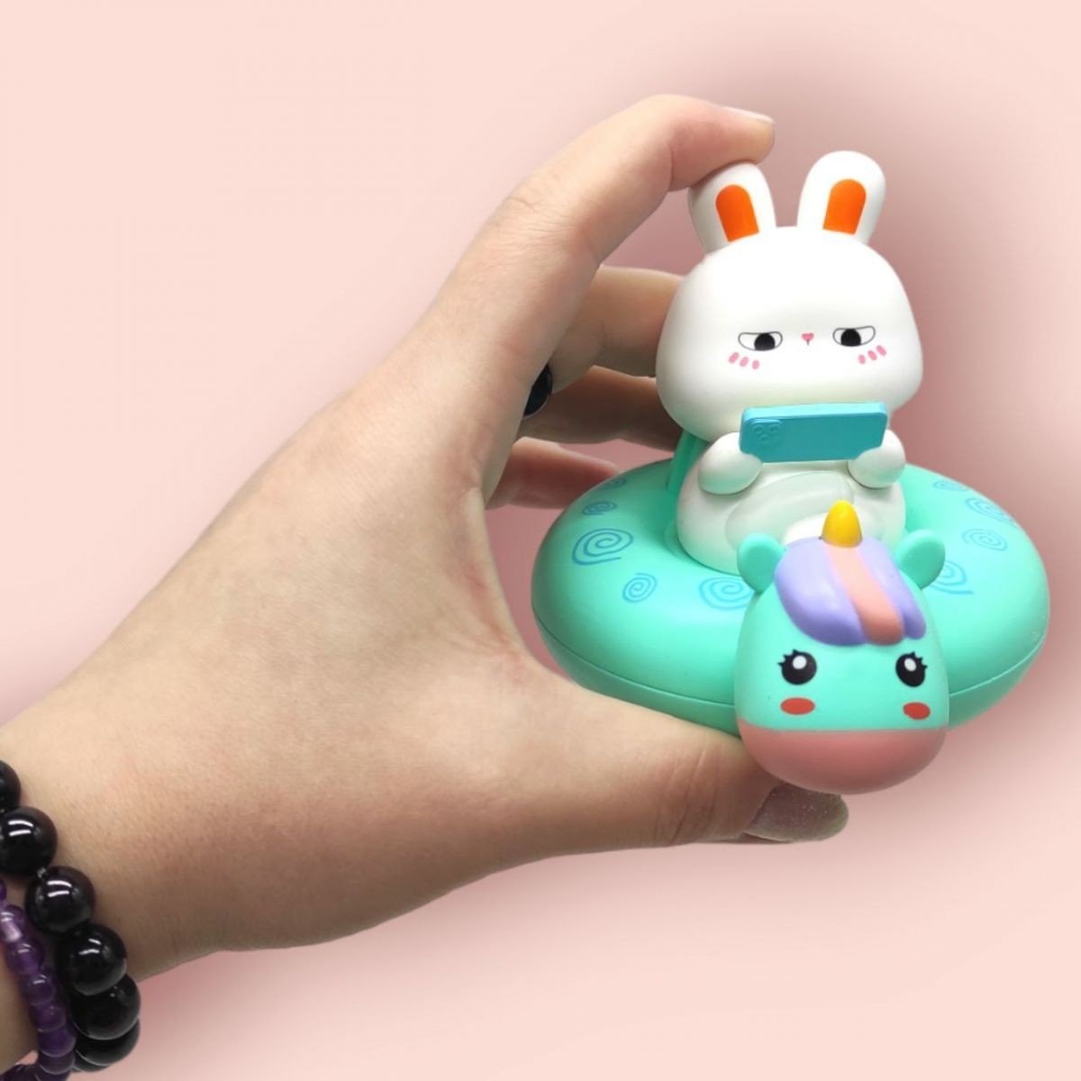 Чарівна іграшка для ванни у вигляді звірятка на повітряному колі. Щоб іграшка почала плавати у воді, потрібно провернути важіль знизу. Тоді лопаті почнуть обертатись і іграшка швидко попливе вперед. Виконана з якісного та міцного пластику. Розмір: 11х9х6 см.