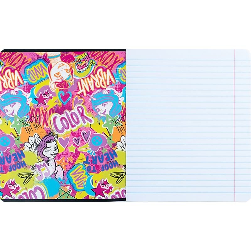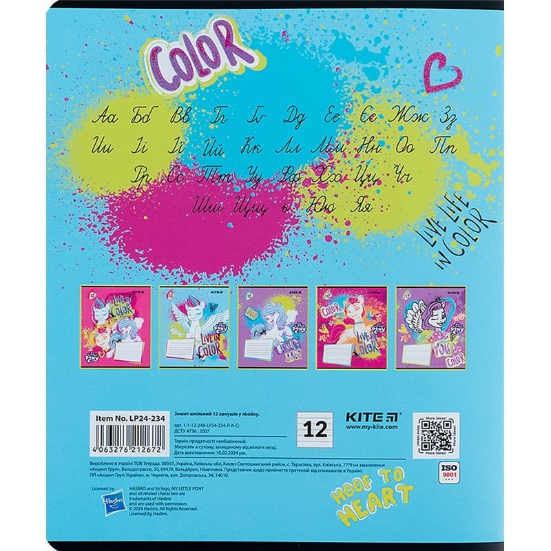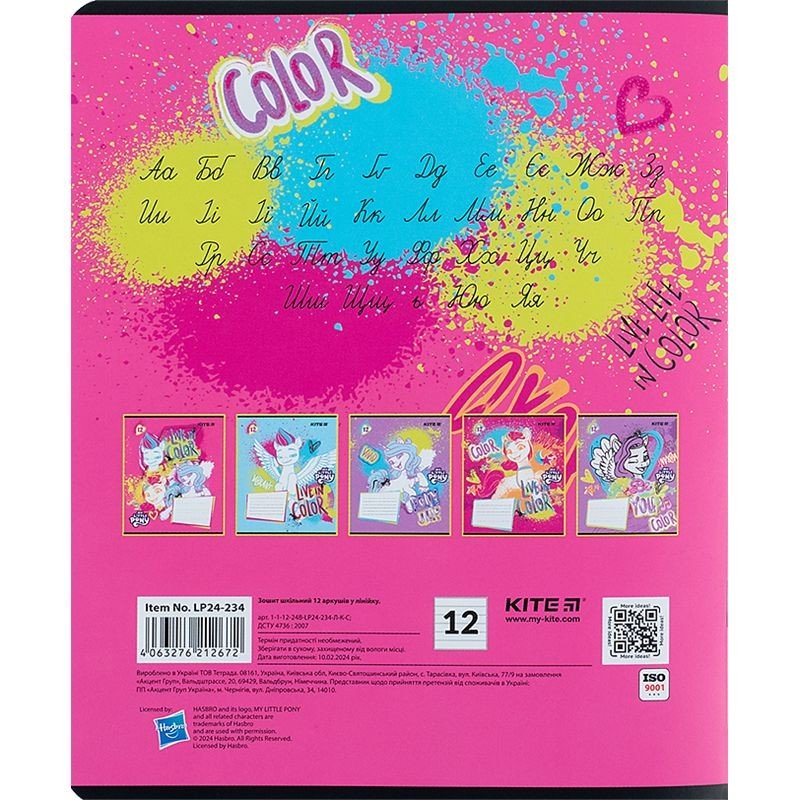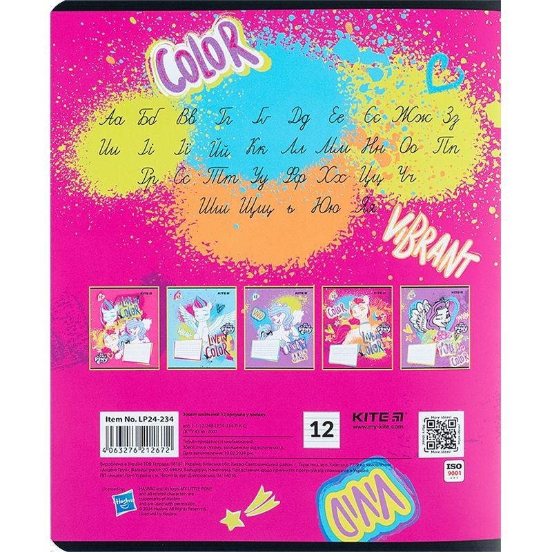 Зошит шкільний на скобі Kite має 12 аркушів, представлений у зручному форматі А5. Аркуші в зошиті зроблені зі щільного паперу, розлініяні в лінію. Виріб представлено в ущільненій кольоровій обкладинці з ліцензованими зображеннями в 5 дизайнах. Ефект на обкладинці:уф-лак+глітер з гібридним лаком. Кольорова задруківка форзаца.