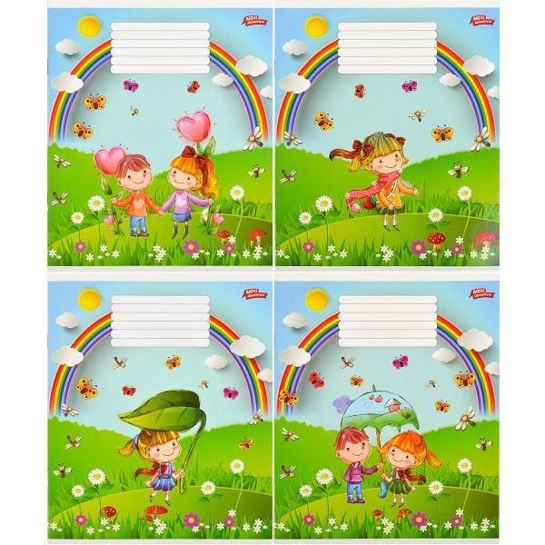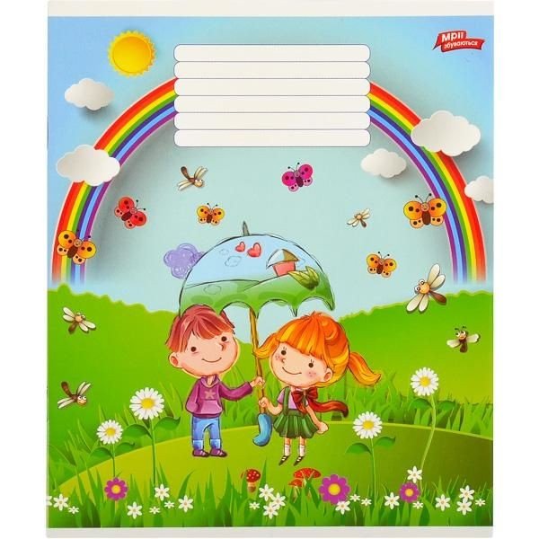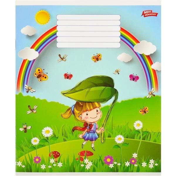 Зошит шкільний на скобі має 12 аркушів, представлений у зручному форматі А5. Аркуші в зошиті зроблені зі щільного паперу, розлініяні в лінію. Виріб представлено в ущільненій кольоровій обкладинці у 4 яскравих дизайнах. Продаються комплектом 20 штук в упаковці.